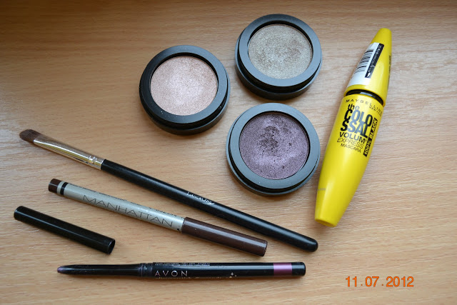 Do wykonania makijażu użyłam w/w cieni, pędzla do nakładania cieni LancrOne, kredki diamentowej Sugar Plum z AVON, ołówka do brwi Manhattan oraz czarnego tuszu Collosal.