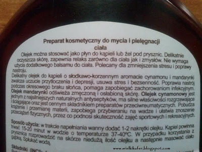 Olejek mimo, że to tylko żel pod prysznic traktuję jak drogocenny kosmetyk do domowego SPA. Bardzo podoba mi się intensywny zapach cynamonu i mandarynki. To połączenie idealnie regeneruje zmęczoną duszę po całym dniu. Żel nie wysusza skóry, nawilża ją i pielęgnuje – dba więc także o ciało. Nie sądziłam, że tak można się podniecać żelem pod prysznic, ale chyba jednak można. Mam w zapasach wersję Sandałowiec, Neroli i Róża, która pachnie tak samo fantastycznie jak wersja Mandarynka i Cynamon. Nie pozostaje mi nic innego jak zachęcić was do kupna i delektowania się chwilą spędzaną pod prysznicem lub w wannie pełnej gęstej piany!