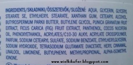 Szczerze mówiąc krem trochę mnie rozczarował. Liczyłam, że skoro jest to kosmetyk do suchej skóry, to będzie miał gęstą masłową konsystencję. Tymczasem krem ma postać balsamu, jest bardziej lejący niż zwarty. Sam zapach bardzo mi się podoba, jest w sam raz na wiosnę i lato. Przeszkadza mi to, że balsam z początku zanim się wchłonie, maże się po skórze. Nie lubię tego efektu i to dla mnie duży minus. Mam wersję oliwkową balsamu. Jest to gęste masło o przyjemnym zapachu, które bardzo dobrze pielęgnuje skórę. Liczyłam na to, że wersja granat i figa będzie podobny. Niestety zastało mnie co innego. Mimo wszystko balsam warty jest wypróbowania, cena 9,90 za 500 ml jest bardzo przystępna.