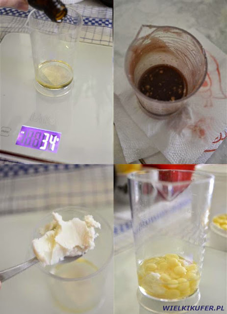 Odważamy po kolei na wadze nasze składniki. Wsypujemy je lub wlewamy do miseczki, a następnie wkładamy ją do garnka z gorącą wodą (tzn kąpiel wodna). Mieszamy składniki aż się rozpuszczą. Kiedy już wszystkie składniki się połaczą dodałam gorzkie ciemne kakao wedlowskie. Uwielbiam mocny zapach i smak kakao więc na taką ilość składników dodałam 1/4 łyżeczki kakao. Wszystko należy dokładnie wymieszać i przelać do umytego pudełeczka.