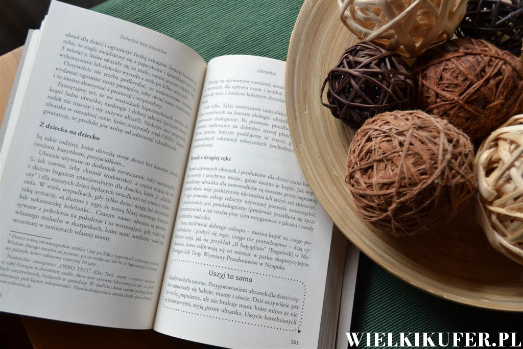 Książka bardzo mi się podobała. Czyta się ją lekko, autorka podaje wiele ciekawych zamienników drogich przedmiotów, radzi jak nie wydać majątku przygotowując się do zostania rodzicem oraz jak kreatywnie spędzać czas. Często bowiem jest tak, że kupujemy coś pod wpływem chwili, a potem dochodzimy do wniosku, że ten czy inny gadżet nam się nie przyda. To powoduje dodatkowy stres, zajmuje miejsce w mieszkaniu, a i tak musimy kupić kolejny przedmiot, który tym razem na być tym docelowym.