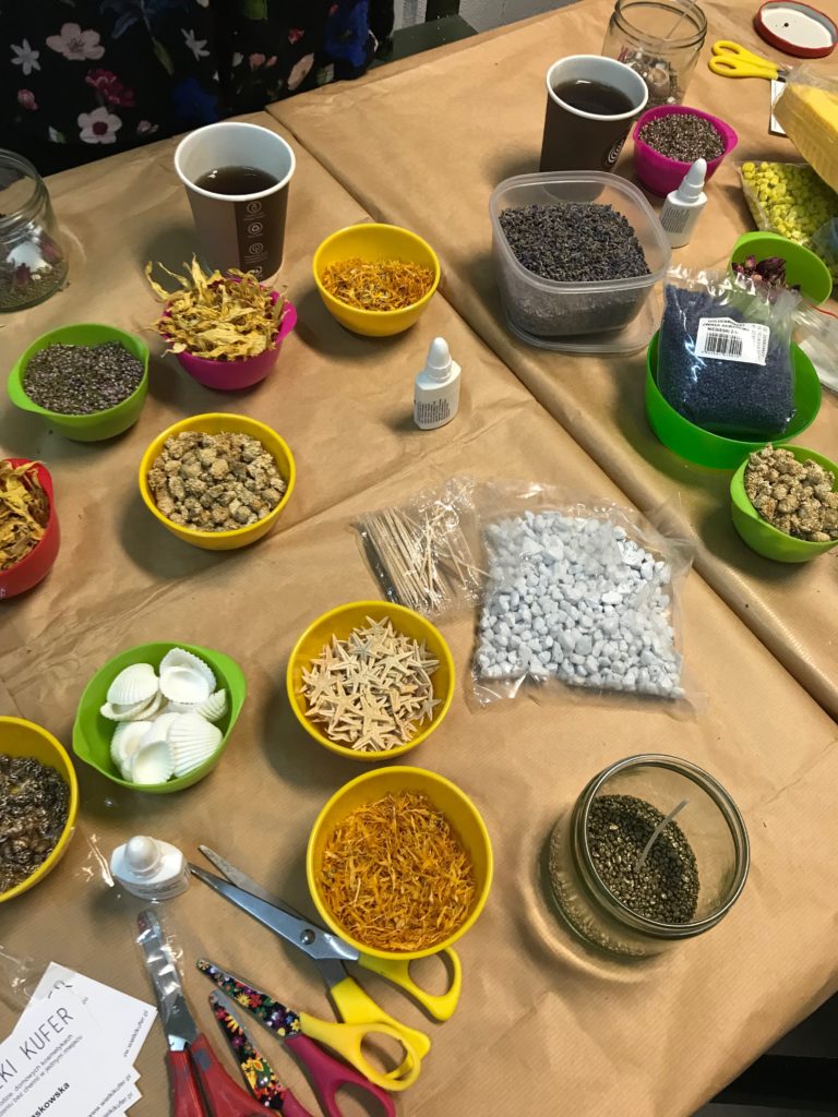 Zapewniamy mnóstwo dodatków na warsztatach. Kolorowe kamienie, muszle małe i duże, piasek w różnych kolorach. Oprócz tego suszone kwiaty i owoce, kolorowe barwniki do świec i cała gamą olejków eterycznych. Wszystko po to, aby świece były pięknie kolorowe i pachnące.